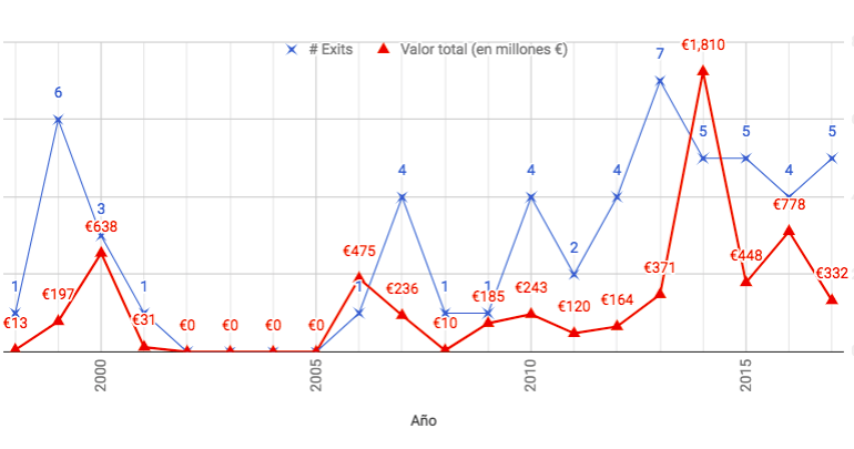 Abajo vemos otra forma de visualizar estos datos desde 1998 hasta el 2017. La línea azul muestra el número de exits ese año, y la línea roja muestra el importe total anual de estos exits. Como vemos, desde el 2006, se ha realizado al menos una venta de startups y desde el 2012 se han llevado a cabo al menos 4 al año.