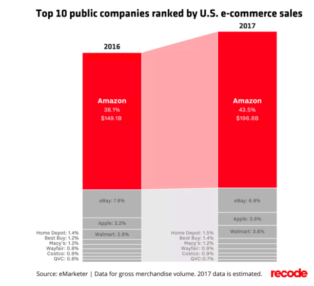 Se estima que Amazon es responsable del 43% de las ventas totales de eCommerce en Estados Unidos en 2017 (38% en el 2016).