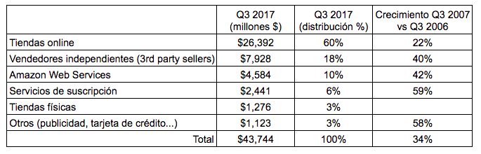 Como vemos en la tabla de abajo, el 60% de las ventas del 3er trimestre de 2017 viene a través de las tiendas online, pero el mayor crecimiento viene de otros canales.
