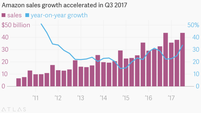 Uno de los factores que explican el incremento en el precio de Amazon son sus buenos resultados del 3er trimestre, con ventas de $43.7 mil millones y un crecimiento del 34%, por encima de lo que esperaban los analistas. Su adquisición de Whole Foods por $13.7 mil millones en agosto de este año también ha empezado a generar resultados muy positivos para Amazon y es indicativo del impacto que puede tener Amazon en grandes sectores como el alimenticio y farmacéutico. Whole Foods ha contribuido ya con $1.3 mil millones en ventas este trimestre.