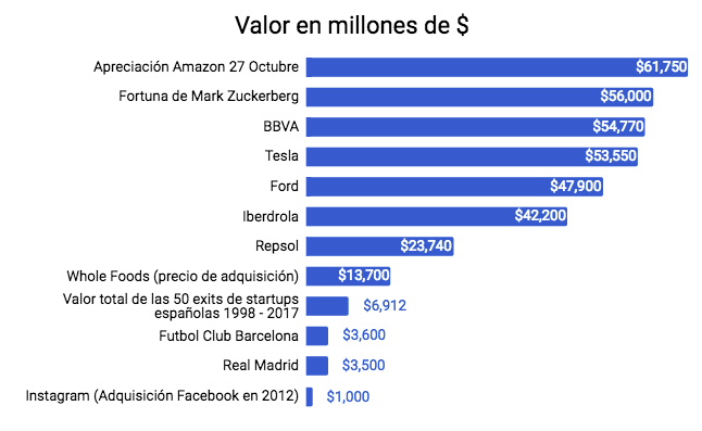 Para poner esto en perspectiva, en cuestión de un día Amazon aumentó de valor en lo equivalente a la suma de Repsol más Ford Motor Company. Los $61.750 millones de revalorización del viernes es un importe superior al valor de 420 de las 500 empresas incluidas en el S&P 500, el índice que incluye a las 500 principales empresas que cotizan en Wall Street. Es 9 veces superior a la suma de todas las ventas de startups españolas desde 1998 hasta 2017.