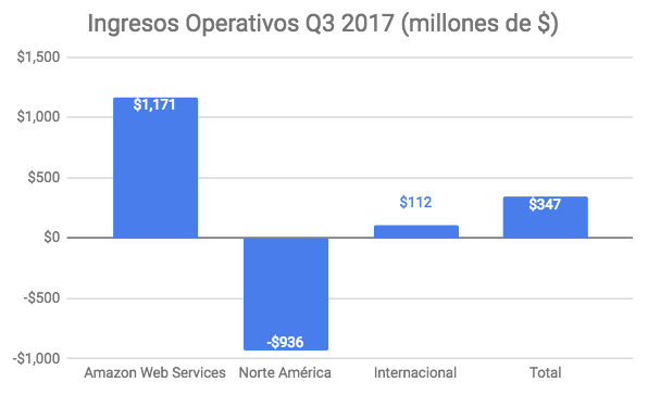 Las ventas de Amazon Web Services también tuvieron un fuerte crecimiento de 42%, y aunque “sólo” representa el 10% del total de ventas, es indudablemente el principal motor de los ingresos operativos de Amazon, que tradicionalmente opera con márgenes de eCommerce muy ajustados.