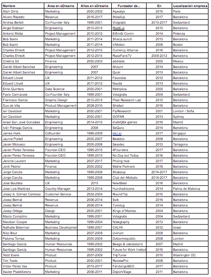 eDreams también refleja el efecto multiplicador que tienen las startups de éxito en el ecosistema tecnológico local de Barcelona. Por lo menos 50 startups han sido fundadas por emprendedores que en su día trabajaron en eDreams, la mayoría de ellas lanzadas en Barcelona. La tabla de abajo tiene una relación de algunos de estos emprendedores (pueden entrar directamente a editar, cambiar y corregir)