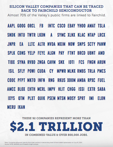 Un artículo en Techcrunch en 2014 apuntaba que el impacto de Fairchild Semiconductors en empresas privadas era aún mayor, con más de 2000 startups (Instagram, Whatsap, Youtube, Pixar, etc…) con un link directo a Fairchild Semiconductors.