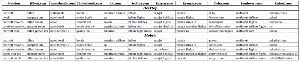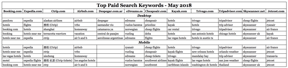 As we see on the Top Paid Search Keywords table below, most of the top paid search keyword campaigns from the 23 online travel sites contain their own brands. This is particularly the case for the 4 hotels. In the case of Booking.com and Expedia.com, we see more non-branded terms, such as “hotels”, “motels”, “flights”, “Las Vegas hotels” and “hotels near me”. We also see a clear strategy of getting traffic with keywords containing competitor and supplier brands. For example, 6 of the top 10 paid search keywords for Jetcost.com are airline (Air France, Ryanair, Transavia) and competitor metasearch (Kayak) brands. 5 of the top 10 paid search keywords for eDreams .es include supplier keywords (Norwegian, Vueling, Ryanair). 4 of the top 10 Cheapoair.com keywords contain Delta, Southwest and Priceline. Some airlines such as Ryanair.com also have top keywords including competitor brands (Easyjet and British Airways).
