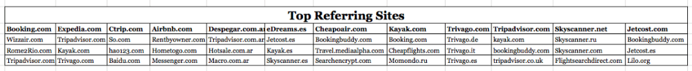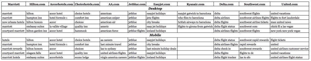 By looking at the leading sites that drove direct clicks to each of the 23 players in this analysis, we see that many of the referring sites are metasearches. Kayak is one of the top 3 referring sites for 8 of the websites: Expedia.com, eDreams.es, Tripadvisor.com, AA.com, Jetblue.com, Delta.com, Southwest.com, United.com. Skyscanner is an important source of traffic for the flight oriented OTAs such as eDreams. Additionally, Easyjet and Ryanair’s top three referring sites are all Skyscanner sites.