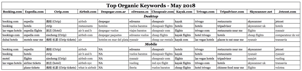 79% of Tripadvisor’s traffic comes from organic search (average for the 23 websites is 34%), enabled by its more than 600 million reviews. In the Top Organic Keyword table below, we see the top desktop and mobile keywords generating organic search traffic. Only 2 of Tripadvisor’s top 10 organic search terms have the Tripadvisor’s brand, while the remaining 8 are generic highly searched keywords (“restaurants”, “hotels”…), which highlights the value of the very rich and deep content in Tripadvisor. With 64%, Ctrip also has a very significant percentage of traffic coming from organic search. Most of its top organic search terms contain the Ctrip brand. Booking.com (19%) and Trivago.com (20%) have the lowest share of traffic coming from organic search. This does not necessarily point to a “failure” in itself. 19% of Booking.com’s 428 million visits is 81 million visits, more than the total traffic of every other competitor here, with the exception of Tripadvisor and Ctrip. Additionally, Booking is the largest online marketing advertiser in online travel, and this reduces the relative share of the non-paid online sources of traffic (direct, organic search).