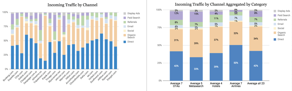 In previous posts, I’ve looked at financials and competitive trends for publicly traded online travel companies. In this post, I will look at traffic and marketing channel data for some of the world’s largest online travel websites for Online Travel Agencies, hotels, airlines and metasearches.