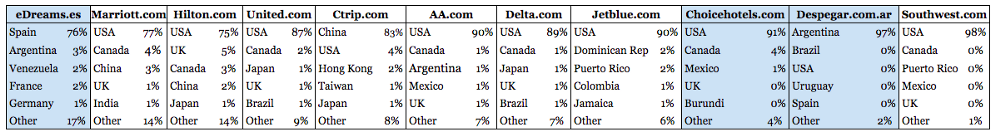As I mentioned at the beginning of this post, we should keep in mind that some of these websites are country specific (blue background in the table below) and others are global domains (white background). The table shows the traffic by country origin, ordered from most to least geographically diversified.
