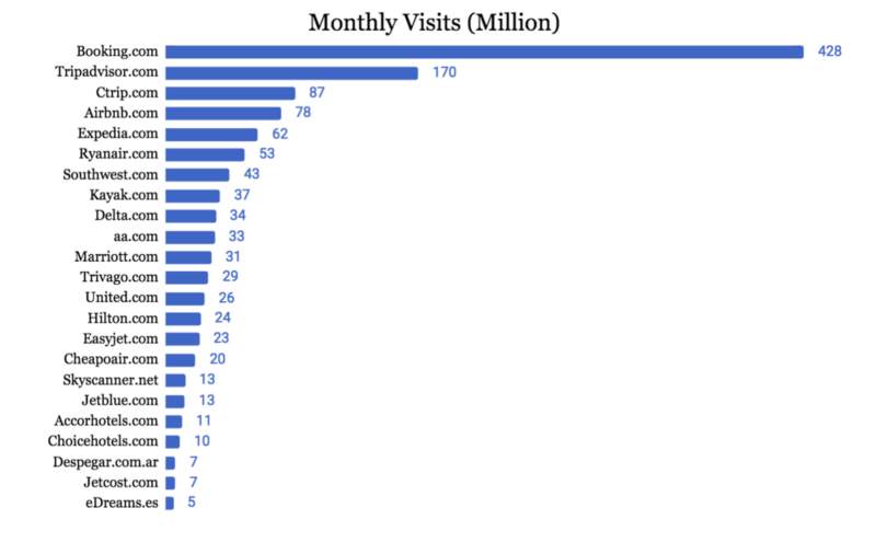 Booking.com leads by a very large margin, although we need to keep in mind that their .com domain is used globally, as opposed to the country specific domains from other players like Tripadvisor, Airbnb and Expedia. But in any case, we see that OTAs and platforms such as Booking, Expedia, Ctrip and Airbnb are well ahead of direct hotel and flight suppliers in their ability to generate traffic to their domains.