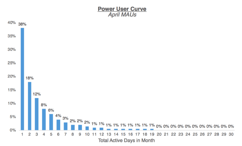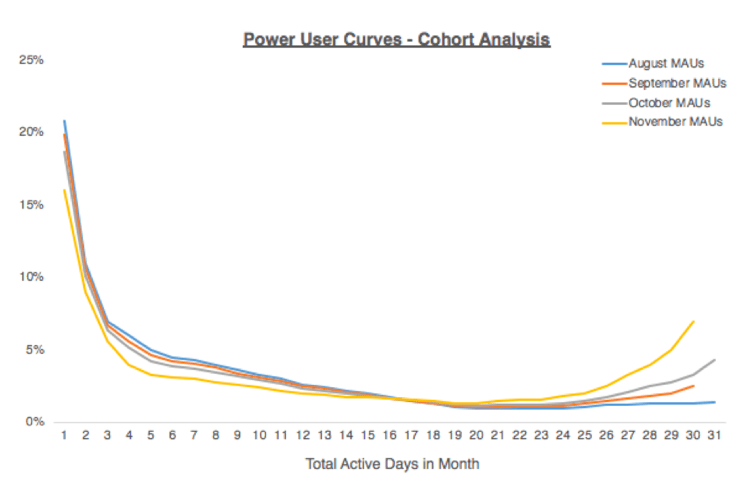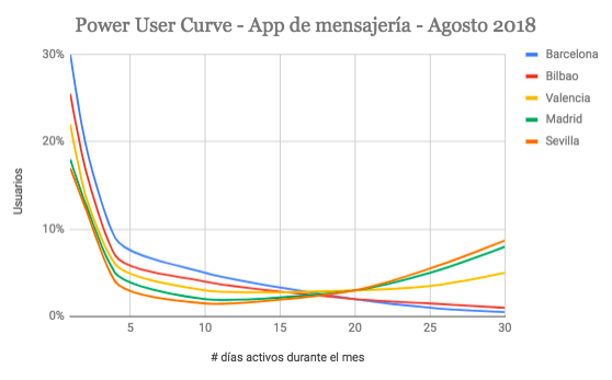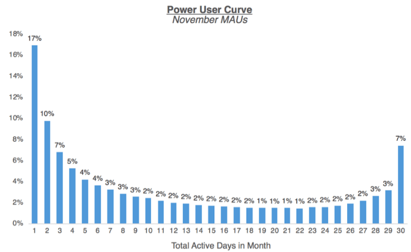 Andrew Chen, socio de Andreessen Horowitz considera que la mejor forma de evaluar el nivel de engagement es mediante la Power User Curve (PUC). La PUC es un histograma del engagement de los usuarios en el transcurso de un periodo de tiempo determinado. Por ejemplo, 30 días. Muestra el % de los usuarios que estuvieron activos desde sólo 1 día hasta los 30 días del mes. La curva puede analizar diferentes variables de actividad: aperturas, logins, compras, transacciones, ofertas, nuevo contenido, etc…