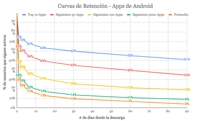 Andrew Chen analiza en su blog la actividad de las apps en Google Play, con datos de 125 millones de móviles. En 2015, las más de 1.5 millones de apps en Google Play perdían en promedio un 77% de sus usuarios en los primeros 3 días, un 90% en los primeros 30 días y un 95% en los primeros 90 días. Incluso las top 10 apps perdían la mitad de sus usuarios al cabo de 90 días.