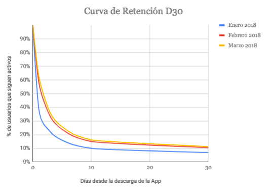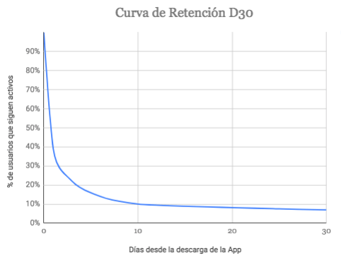 Las curvas de retención D1, D7 y D30 muestran el % de usuarios que han tenido alguna actividad 1, 7 y 30 días después de haber descargado la aplicación.