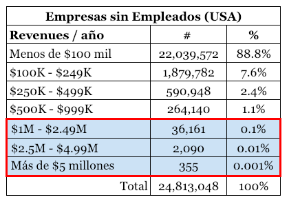 En su libro The Million-Dollar, One Person Business y en sus artículos en la revista Forbes, Elaine Pofeldt se enfoca en el subsegmento de empresas sin empleados que están generando ventas anuales superiores a $1 millón. Según el ultimo censo de 2016, había más de 38 mil de estos negocios con ingresos superiores a $1 millón, un crecimiento del 35% en los últimos 5 años. Los sectores más representados entre estos emprendedores solitarios son los Servicios Profesionales (25%), Construcción (12%), Retail (8%).
