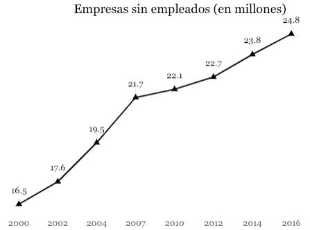 Estas empresas sin empleados son un factor cada vez más influyente en la economía americana. Según los datos del censo más reciente, en 2016 había casi 25 millones de estos negocios en Estados Unidos, cuya actividad representa la principal fuente de ingresos para el 40% de los propietarios. Aunque algunas de estas empresas incluyen sociedades limitadas, la gran mayoría de las empresas sin empleados son negocios de una sola persona (siete de cada ocho, ó 21.7 millones) que trabajan por su cuenta, por lo que también nos podemos referir a ellos como emprendedores autónomos (“solopreneurs” en inglés). El 30% trabajan más de 40 horas, y el 50% trabajan menos de 20 horas por semana. El promedio de ingresos de estos emprendedores autónomos es de $47.000 / año.