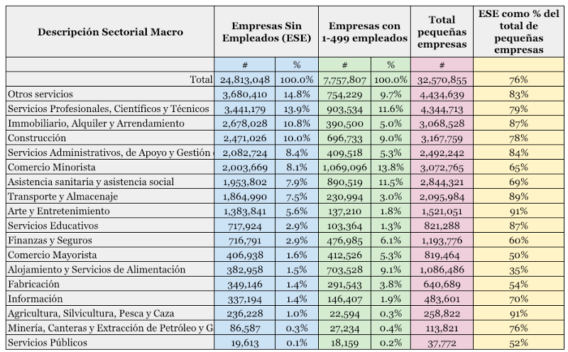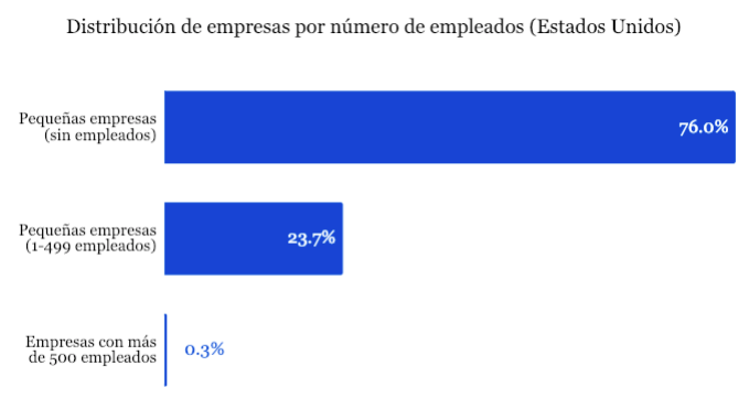 Las pequeñas empresas (menos de 500 empleados) representan el 99.7% de las empresas en Estados Unidos y emplean al 47.5% de la fuerza laboral. La gran mayoría de estas pequeñas empresas son precisamente las empresas sin empleados. Y del total de empresas en Estados Unidos de cualquier tamaño, el 76% son negocios sin empleados.