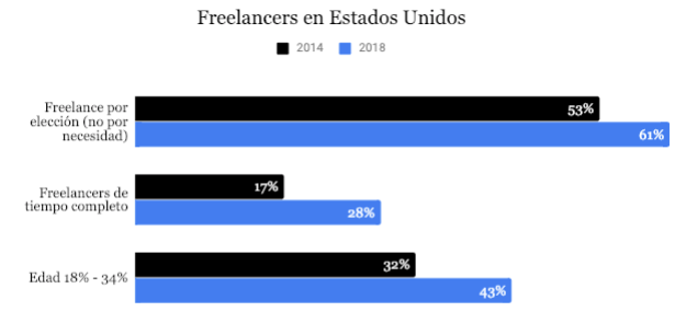 Un 35% de los trabajadores en Estados Unidos trabajaron como freelancers en 2018. Según Edelman Intelligence, hay 57 millones de freelancers, 4 millones más que en 2014. De seguir con esta tendencia, se estima que en 2027 más de la mitad de la fuerza laboral estadounidense será freelance.