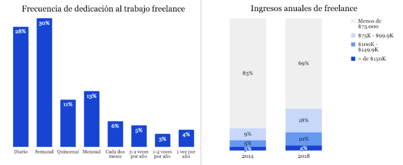 Un 58% de los freelancers tiene una dedicación diaria o semanal a su actividad de freelance. Los ingresos de los freelancers han ido en aumento. Un tercio tuvieron ingresos anuales de más de $75.000 en 2018, frente a un 18% en 2014.