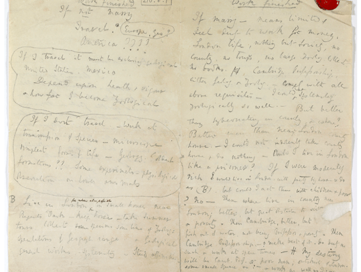 A los 29 años, un año y medio después del final de su expedición, Darwin se enfrentaba a una duda existencial: casarse o no casarse? Una de las mentes más privilegiadas de la historia no tenía claro cómo llegar a la decisión correcta, por lo que decidió hacer una sorprendente lista de pros y contras de casarse con Emma Wedgwood cuyo contenido nos da un acceso único al cerebro de Darwin y a sus pensamientos más íntimos.